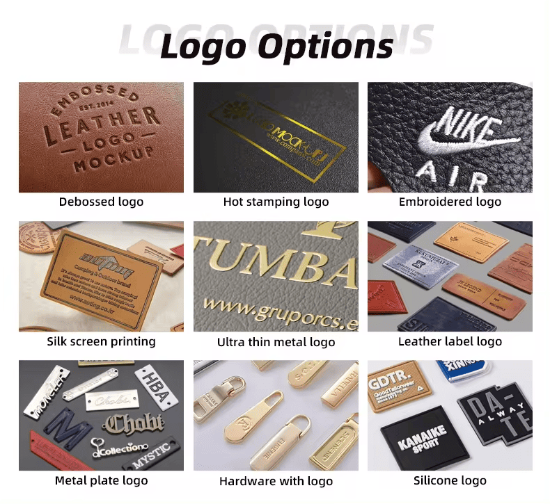 Popular materials: Crazy horse leather, full-grain leather, premium PU Branding: Debossed logo, centered or corner-placed