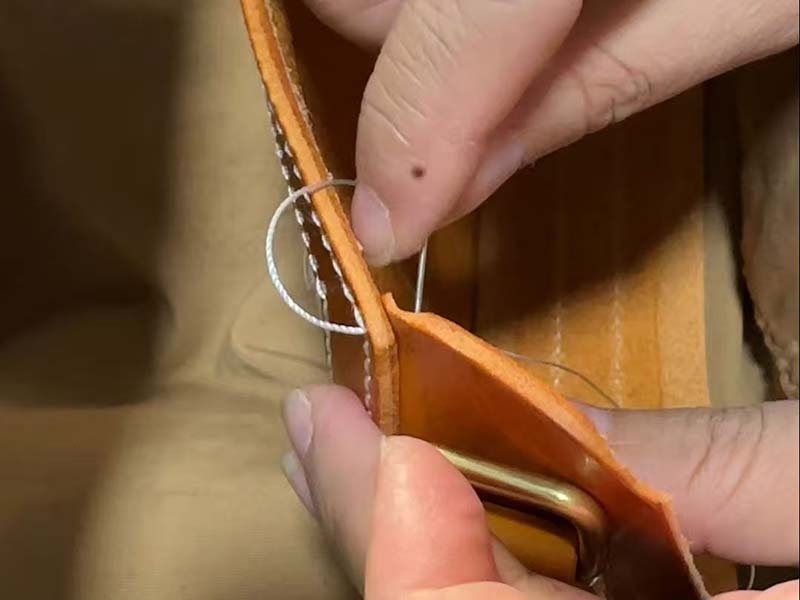 In a saddle stitch, the two threads pass through each hole and lock inside the material. If one thread ever snaps, the opposite side maintains tension — a vital feature for heavy-use products like belts, satchels, or straps. Machine stitching, by contrast, uses a looping system with a bobbin. If that loop breaks, the entire seam can unravel.