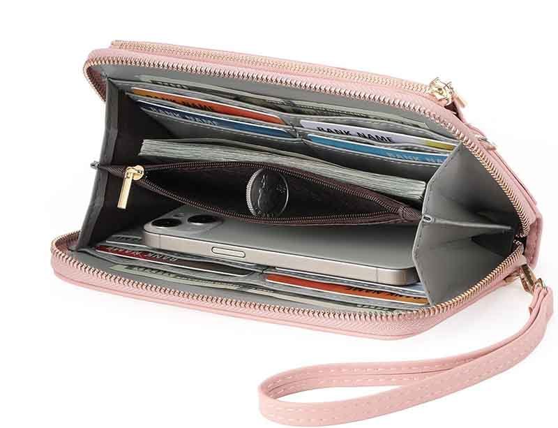 A wallet-style pocketbook merges financial functionality with visual appeal. It’s both a wallet and a small bag — slim enough to fit in a tote, but polished enough to carry alone.