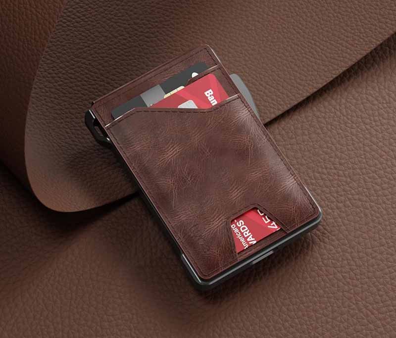 A rising trend, minimalist wallets focus on slim design and fast access. Usually built from aluminum, carbon fiber, or thin leather layers, they hold 4–6 cards in total. Some use a push-eject system to fan cards out neatly.